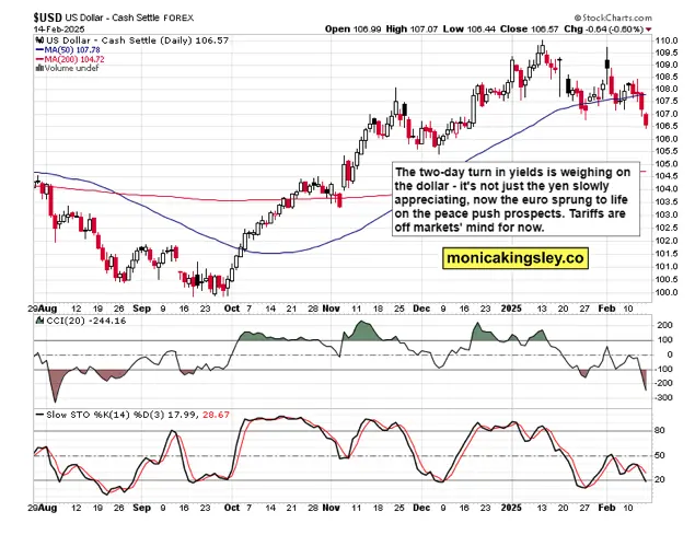 This weekend‘s extensive video dives into yields, USD, and prospects for various assets (it‘s so rich, thanks for liking and subscribing to the daily channel!) – the gold and silver reversal (together with copper) raise some eyebrows, and that makes it crucial to focus on objective analysis of such slamming, especially when the peace dividend should work differently for precious metals, and crypto too – but that‘s a longer-term perspective. European stocks and luxury goods though get it right.