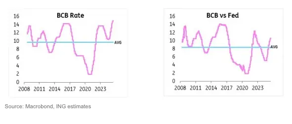 The charts below show the BCB rate (left) and the spread above the Fed funds rate (right). Both in (%)