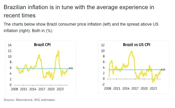 The 5.5 area is where BRL/USD needs to track at for the BCB to cut rates, and we’d need a run of time in that area, and ideally the beginning of a Fed cutting phase to allow room for BCB cuts. If the Fed were to cut by 125bp and Brazilian inflation falls to 4.5%, then the 3.5% buffer gets close to 5%. That would mean that there could be some 200bp of cuts from BCB, while maintaining a residual 3% buffer (bad fiscal noise protection). That’s doable as a 2026 outcome. But it does in part depend on the fiscal noise quietening some more. In the end that will determine whether BCB cuts by more or less than the 200bp suggested, and by how much.