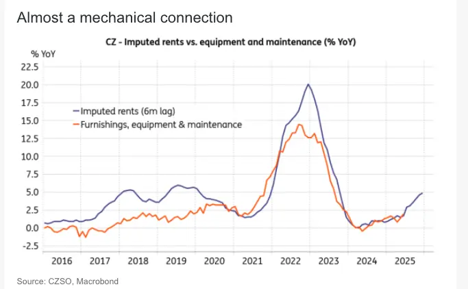Further statistical inquiry confirms that the two series are cointegrated, showing strong long-term common dynamics. Granger causality exploration clearly confirms that changes in imputed rents precede and can predict changes in equipment and maintenance prices. These two time series simply show a textbook case for this type of strong relationship that would definitely be worth including in econometric exercises. Moreover, there is a straightforward economic reasoning to the relationship: you build more and acquire more properties during a booming housing market, you buy more equipment and request more maintenance, and prices of both rise as demand exceeds supply, at least temporarily. Ergo, the likelihood of even more potent core inflation than in our projection is not negligible.