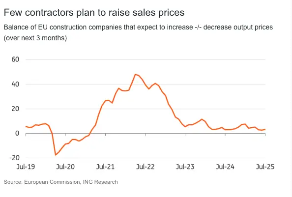 Few contractors are planning to increase their sales prices in July 2025. Contractors don’t have to pass on higher input prices and are still encountering strong competition due to the production decline in 2024 and expected zero growth in 2025. The balance of EU contractors who plan to increase sales prices even decreased from 8% in January to 3% in July.