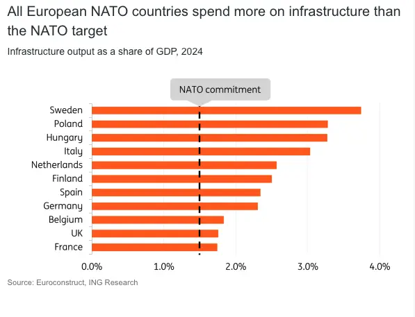 However, most European NATO countries already invest more than 1.5% of their GDP in infrastructure. While not all infrastructure spending is defence-related, the broad definition of resilience allows for flexible interpretation, potentially leading to “infrawashing.” For instance, Italy plans to classify its proposed bridge to Sicily as strategic military infrastructure under this framework.