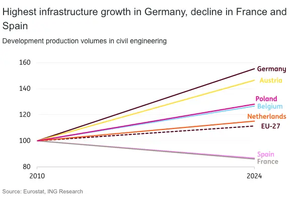 In Germany, investments increased by more than 55% between 2010-24. That is needed because German infrastructure is in a patchy state, and investments in roads and digital infrastructure are driving some growth in this subsector. Germany launched a €500bn infrastructure and climate investment plan last year, which will result in further growth in the coming years.