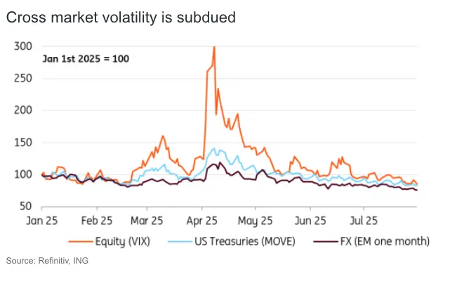 That said, cross-market levels of volatility continue to edge lower and barring some big shock, it looks like volatility levels could remain low this August.