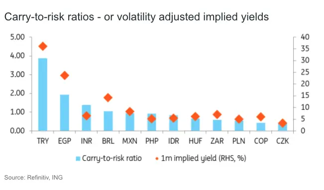 But high yields need to be seen in the context of risk. There’s no point picking up pennies in front of the steamroller, after all. And that’s where the ‘carry-to-risk’ ratio comes in. Below, we adjust the one-month yields available through the FX forwards by implied – or expected volatility through the FX options market.