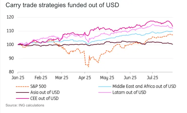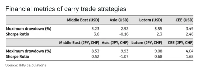 There are a myriad of permutations to look at when it comes to the carry trade, but in this exercise we’re looking at emerging market high yielders in four regional blocs: Middle East and Africa (Turkey, Egypt and South Africa), Asia (India, Indonesia and Philippines), Latam (Brazil, Mexico, Colombia) and Central and Eastern Europe (Poland, Hungary, Czech Republic).