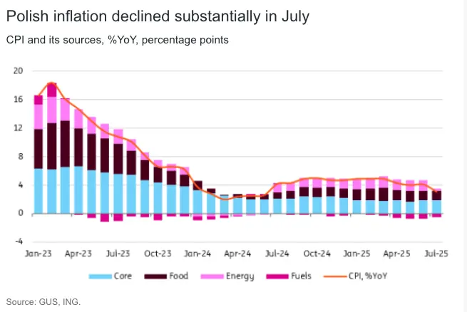 The sharp decline in CPI inflation was not surprising; however, we had hoped for an even deeper slowdown. We expect that in August, inflation will ease further towards the central bank target of 2.5% (+/- 1 percentage point) and stay broadly stable at low levels in the coming months. Higher-than-expected CPI in July does not change the generally positive disinflationary trends, and the Monetary Policy Council (MPC) has substantial room for further rate cuts. We believe the Council will cut policy rates at its next meeting scheduled for September.