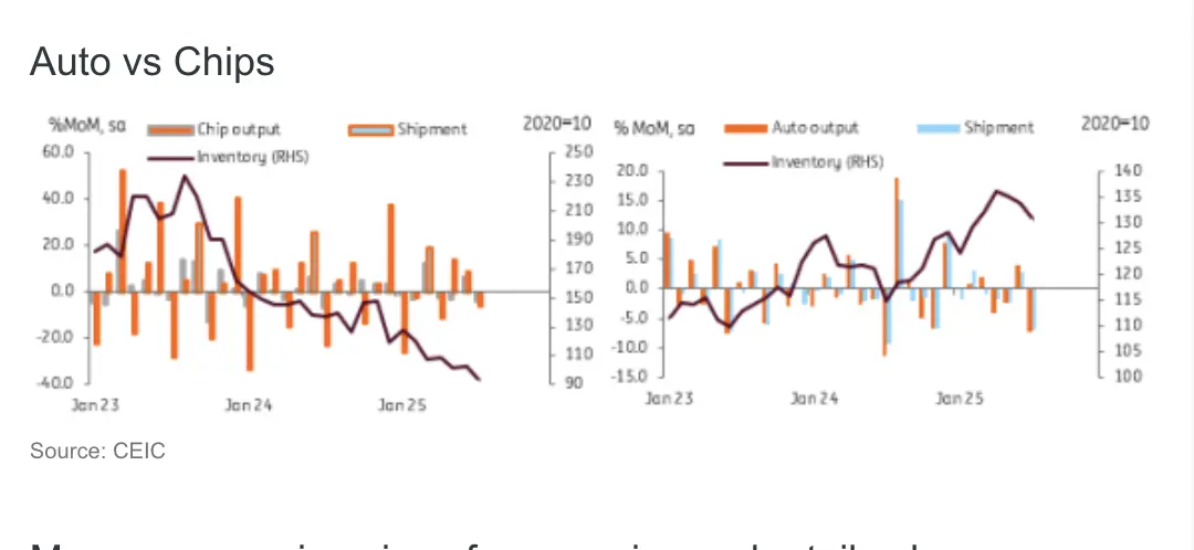 The biggest impact of the US tariffs is on the motor sector. Output dropped 7.3%, falling three months out of four, while shipments also dropped 7.1%. A 25% auto tariff is expected to weigh on the industry going forward