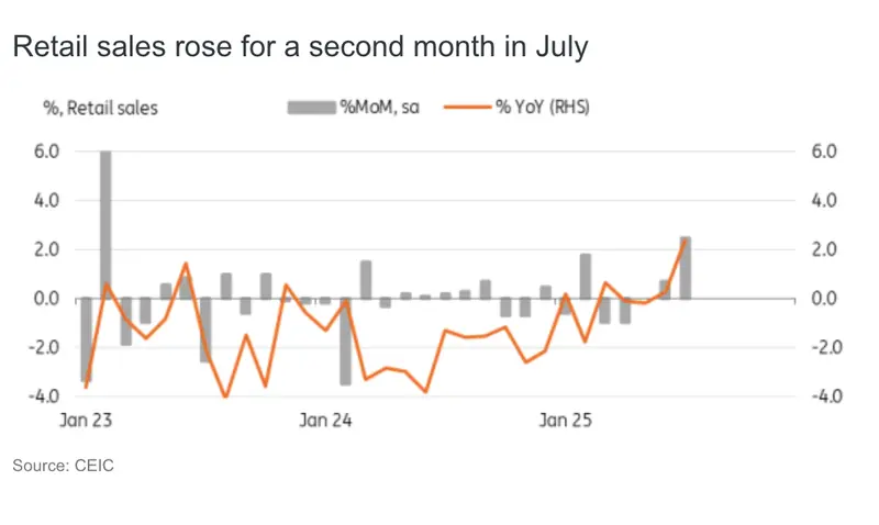 Retail sales advanced 2.5% in July, partly boosted by a jump in mobile phone sales. But other sales were solid as well, with auto sales up 1.8% and household appliances up 6.6%. Semi-durable goods and non-durable goods sales all gained for a second month.
