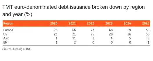 Our forecast miss for issuance by the TMT sector has been driven by a few jumbo deals by non-traditional issuers in euro debt markets. Notably, among these issuers were quite a few operators of data centres. The Japanese telecom and data centre operator NTT has issued €5.5bn of euro notes, Alphabet (Google) has issued €6.75bn and IBM €2.75bn. These are sizeable amounts, as we initially expected the issuance of €50bn of euro notes by TMT companies in FY25. Note these companies have made sizeable acquisitions in 2025.