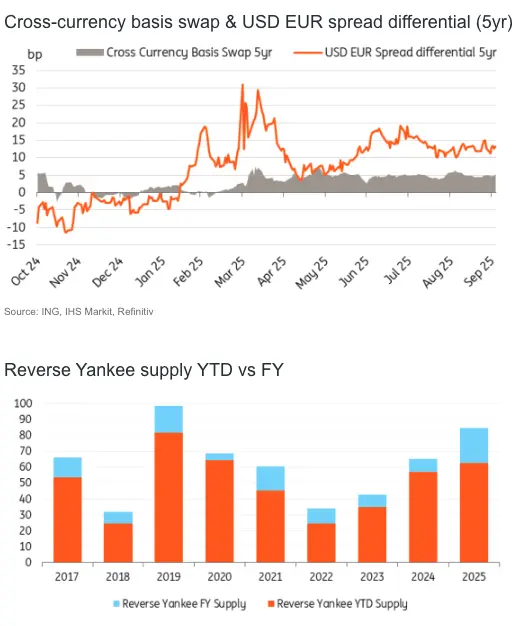 We forecast corporate Reverse Yankee supply to reach up to €85bn in 2025. This will be much higher than the 10-year average issuance volume of €60bn, as well as last year’s €65bn figure. Note that the current YTD Reverse Yankee supply amounts to €63bn. Opportunistic funding will be a large driver for the increase in supply. Additionally, redemptions for Reverse Yankee bonds will rise in 2025 up to €47bn, an increase from the €39bn that matured in 2024.