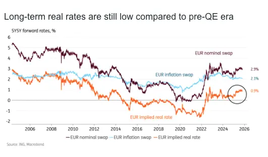 From a rates perspective, the upside potential of a more robust growth outlook would be significant. If we look at 5Y5Y forwards as a measure of market positioning for long-term growth, we have already seen a 50bp increase in real rates since the German spending announcement in March. But even after that jump, the real rate barely reaches 1%, still signalling a downbeat view of future growth. Before the euro sovereign crisis, the 5Y5Y real rate hovered mostly around 2%.