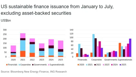 As a result, the sustainable finance volume from corporates and financials retreated to US$58bn in the first seven months of 2025, the lowest since 2020. Moreover, refinancings take up a good part of the issued volume. For instance, Deere & Co’s sustainability-linked loan transactions of US$11.5bn, the largest among all issuers in the US in 2025, were to refinance two revolving credit facilities. This means that capital is not being deployed toward new sustainability commitments. There is also anecdotal evidence that some issuers have lowered or abandoned ESG targets in previously issued ESG-linked debt. Issuance from the rest of the Americas has also substantially dropped year-on-year, likely due to the repercussion effects from the US. In contrast, there has been a year-on-year jump in issuance from supranationals domiciled in the US to fund their ESG commitments globally.