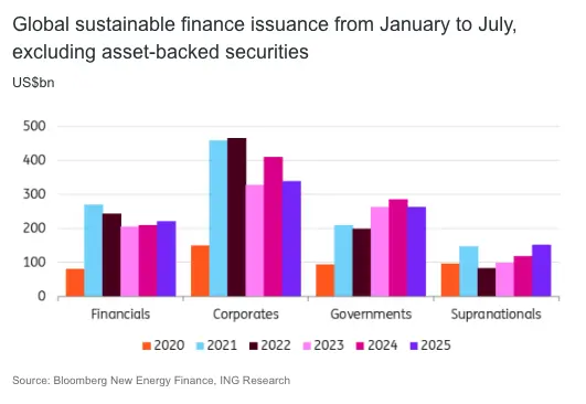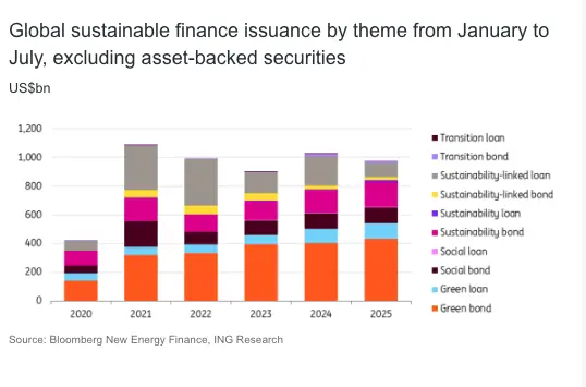 Global sustainable finance issuance amounted to US$975bn in the first seven months of 2025. While this does trail slightly the US$1,027bn seen in the same period last year, given the lower first quarter this year, it does come in higher than the levels seen in 2023.