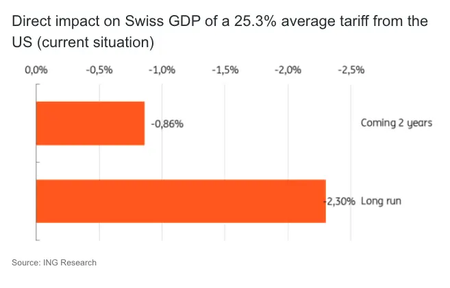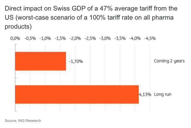 But the reality could be even worse if the pharmaceutical sector were hit with higher customs duties. The chemical and pharmaceutical sector, which accounts for 7-8% of Swiss GDP, has been the main driver of export growth in recent decades. With 60% of Swiss pharma exports destined for the US, the sector is disproportionately exposed to American trade policy shifts. In a worst-case scenario, where 100% tariffs were applied to pharma products, the effective tariff rate for Switzerland would climb to 47%. This would mean an increase of 46.7 percentage points! According to our estimates, this would hit Swiss GDP by 1.7% in the first two years and a 4.13% decline over the longer term. Such a shock could tip Switzerland into recession territory.