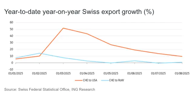 Trade uncertainty is already having an impact on the Swiss economy. While the 39% blanket tariffs only came into effect in August, earlier tariff-related developments, including front-loading ahead of the 'Liberation Day' announcement in early April and the interim 10% tariffs, have already influenced trade dynamics. As a result, export growth remained strong in the first half of the year, with a 51% year-on-year surge by the end of March and still a 9.4% increase in August compared to the same period last year.