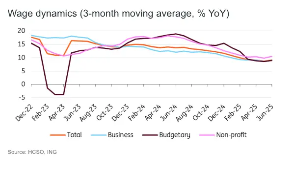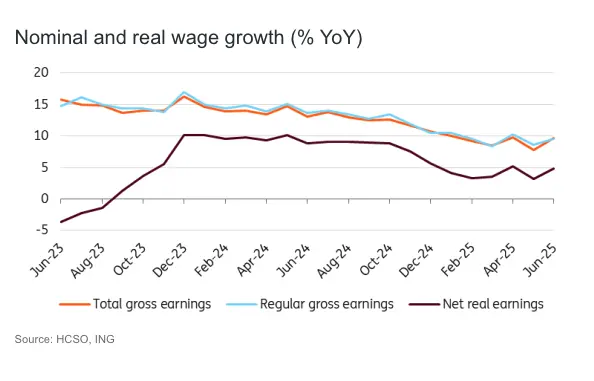 After slowing significantly in May, wage growth accelerated sharply in June 2025. The Hungarian Central Statistical Office (HCSO) reported a 9.7% year-on-year increase in average wages, whereas the market consensus forecast was much lower. Thus, the data can be considered a strong positive surprise. These latest wage statistics add an interesting twist to the narrative of weak economic performance in the second quarter. Although wage growth exceeded expectations for the second quarter as a whole, it has yet to make its positive spillovers into the real economy.