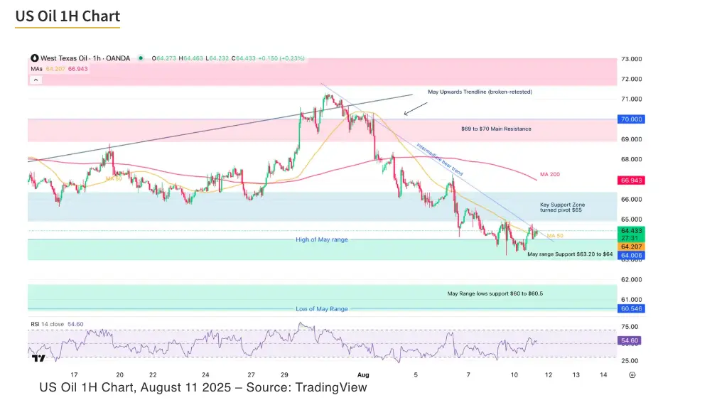 Zooming even closer to the 1H timeframe, WTI buyers are stepping in at the conjunction of the downwards intermediate trendline and the 50-H MA after forming an hourly double bottom around $63.30.