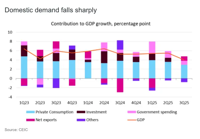 The Philippines’ third-quarter GDP growth slowed sharply to 4.0% year-on-year, falling short of consensus by nearly 1 percentage point. Domestic demand weakened significantly: