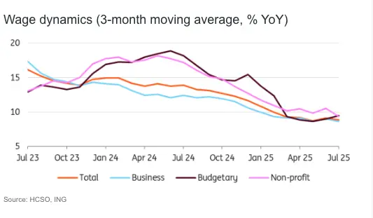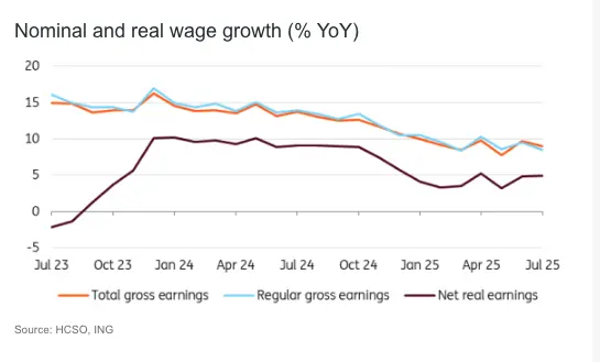 According to the latest report by the Hungarian Central Statistical Office (HCSO), the growth rate of gross average earnings slowed slightly compared to the previous month but remained strong. In July 2025, average wages increased by 9% year-on-year, which is roughly in line with market expectations. Essentially, the trend observed in the first half of the year continued into the second one: wage growth of around 9%, which is insufficient for substantial economic improvement.