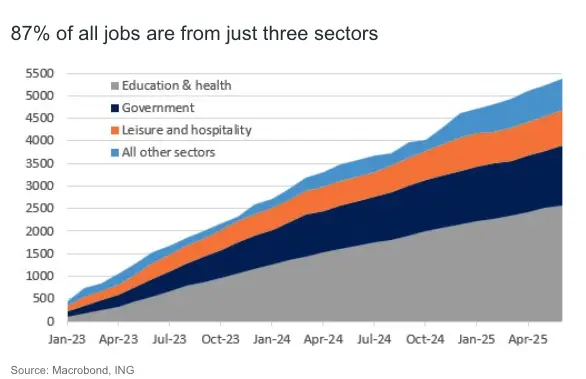 Our suspicion is that government, private education & healthcare services, and leisure and hospitality will become much less supportive through the year and potentially even act as a drag on job creation later this year and into 2026. Private healthcare jobs are vulnerable to the healthcare spending cuts that are part of President Trump's One Big Beautiful Bill Act and if consumers do start to become more cautious in their spending, reflecting the steep falls in sentiment, then discretionary spending on eating and drinking in bars and restaurants and other entertainment tends to be the first thing that gets cut. We also expect to see Federal government workers shrinking as a legacy of Elon Musk's efforts to get a grip on government spending.