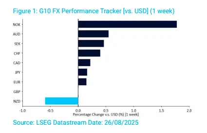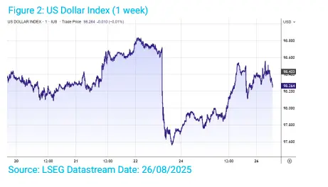 A data-light week was dominated by Fed chair Powell's speech at the annual Jackson Hole conference of central bankers on Friday. The emphasis here was more on potential weakness in the labour market rather than on the recent rebound in inflation further away from the central bank's targets, which the Fed expects to be temporary. While the shift in tone could be justified by recent data, it still leaves open the question of whether the institution is starting to buckle under the relentless political pressure coming from the Trump White House.