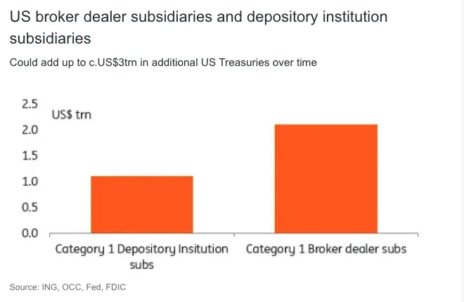 Under the proposal the US broker-dealer subsidiaries and depository institution subsidiaries could add up to c.US$3trn in more US Treasuries or reserves, according to the US agency calculations. That equates to an effective 9% of the current level of marketable debt.