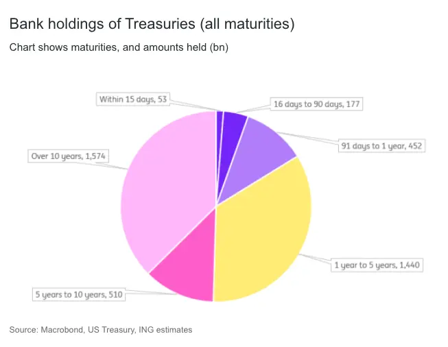 Of the $4.6trn in Treasuries held by banks, half mature in under five years, but $1.6trn have maturities of 10 years or more.