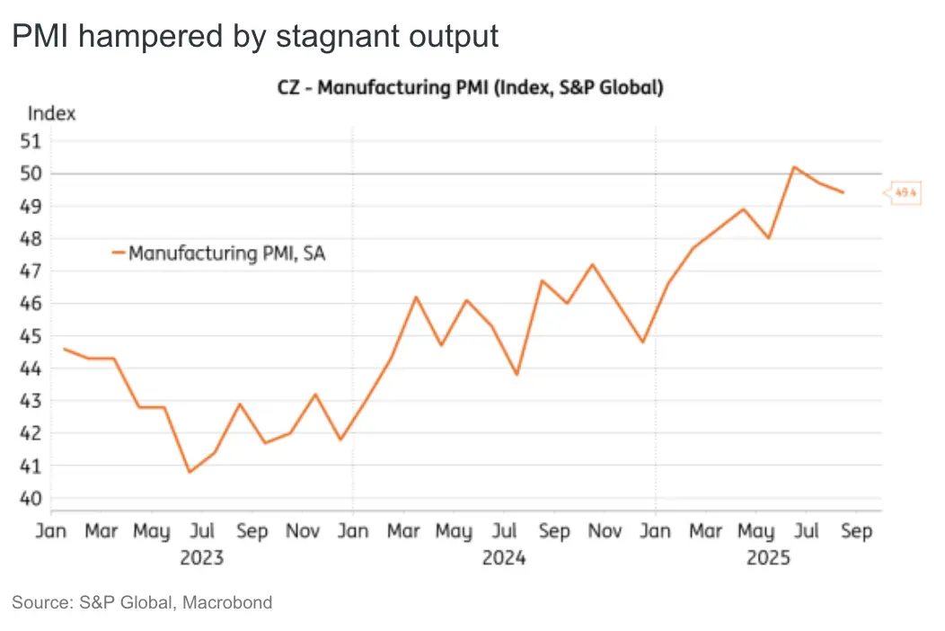 Czech PMI weakened to 49.4 points in August, coming in below market expectations. August was a challenging month for Czech manufacturers in terms of output, as logistical problems constrained production. Production was hampered by delays in material deliveries, as well as the consequences of US customs policy. Overloaded ports and technical issues are reportedly contributing to a deterioration in supply chain performance, with delivery times reaching their longest duration since November 2024.