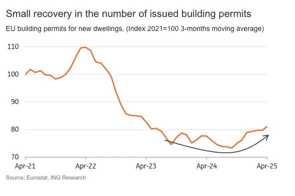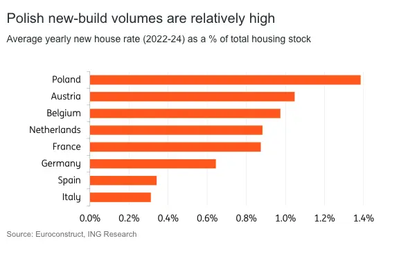 Infrastructure activity has been slow due to delays in Poland's implementation of the Recovery and Resilience Fund, which was frozen for two years due to a rule of law dispute with Brussels. A forecasted decrease in interest rates may lead to a potential recovery in Poland's new residential sector by 2026.