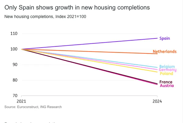 A positive outlier is Spain (again). The housing market in Spain is heating up and house prices are surging. This has created a strong business case for new developments, resulting in a sharp rise in building permits in recent years.