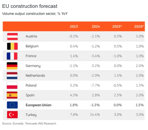 We expect zero growth in the EU construction sector this year. This is a small downgrade compared to our previous forecast. While some modestly positive signals are beginning to surface, they are nothing to write home about. Contractors remain pessimistic, though the situation appears to have bottomed out.
