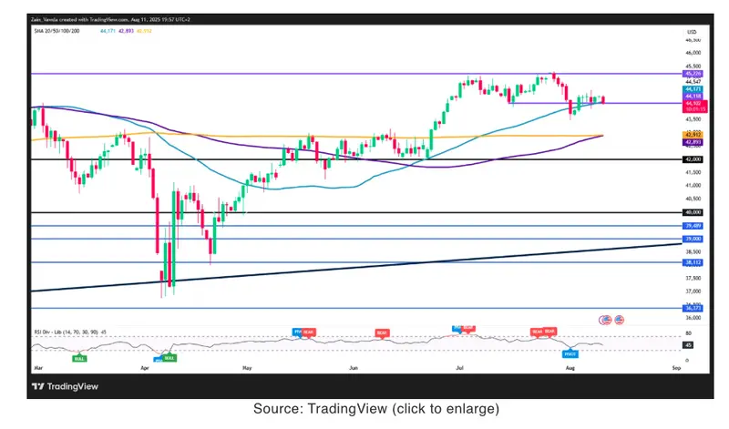 From a technical standpoint, the Dow Jones index is currently testing a confluence level of support at 44100.