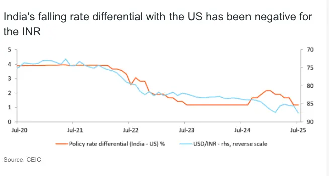 The Indian rupee was the worst performer in the region last month, weighed down by volatile oil prices and lack of a trade deal with the US that was largely expected to be in favour of India. Instead, India received the highest tariff rate of 25% in the region. Given that the US accounts for almost 18% of India's exports, the 25% tariff rate could have a meaningful impact on GDP growth. However, we think it’s likely that both nations will continue the negotiations, using levers such as reducing imports from Russia, and India could end up with a lower tariff rate. In the interim, uncertainty could weaken investor sentiment, as also reflected in FII outflows in July. Today’s rate move should help INR stabilise, especially at a time when India’s policy rate differential with the US is at a multi-year l