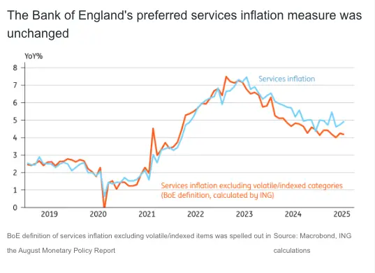 Services inflation – the bit usually most relevant for the Bank of England – rose to 5% from 4.7%. That was enough to drag core inflation up slightly too. But this was overwhelmingly down to a larger-than-usual rise in airfares. These are particularly volatile in July, depending partly on when the survey date falls relative to the start of school holidays. Interestingly, hotel prices – which many expected to surge amid Oasis’ tour dates – barely increased on the month.